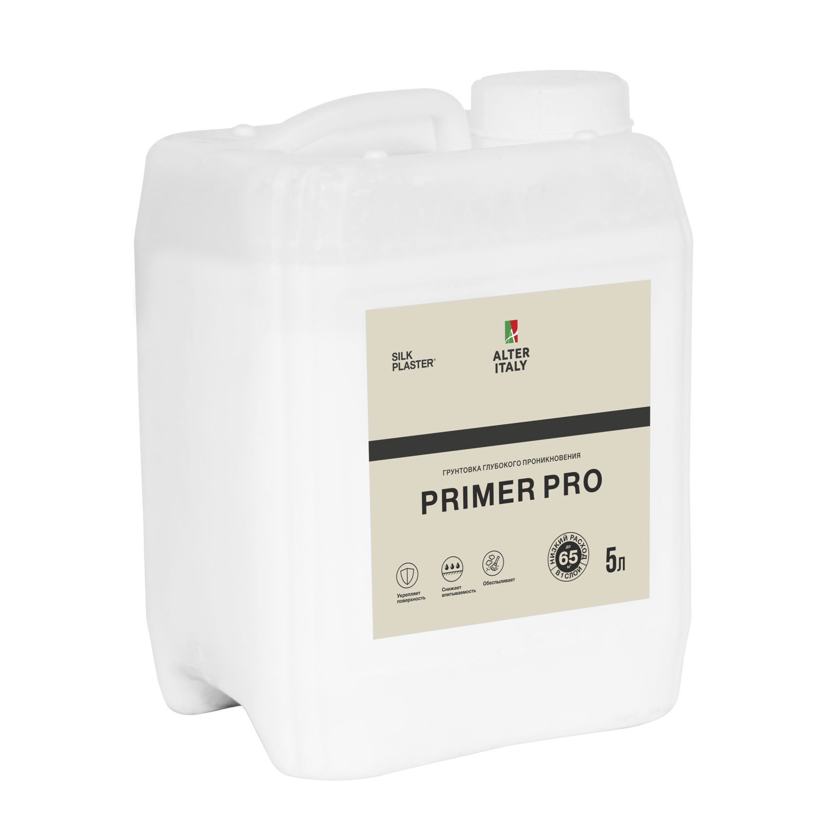 Водно-дисперсионная грунтовка глубокого проникновения ALTERITALY Primer PRO для внутренних и наружных работ. Укрепляет поверхность, связывает пыль, выравнивает впитывающую поверхность основания, имеет высокую проникающую способность. Продукт полностью готов к применению. Не разбавлять! Не смешивать с продукцией других производителей! Не вводить в состав другие химические компоненты!